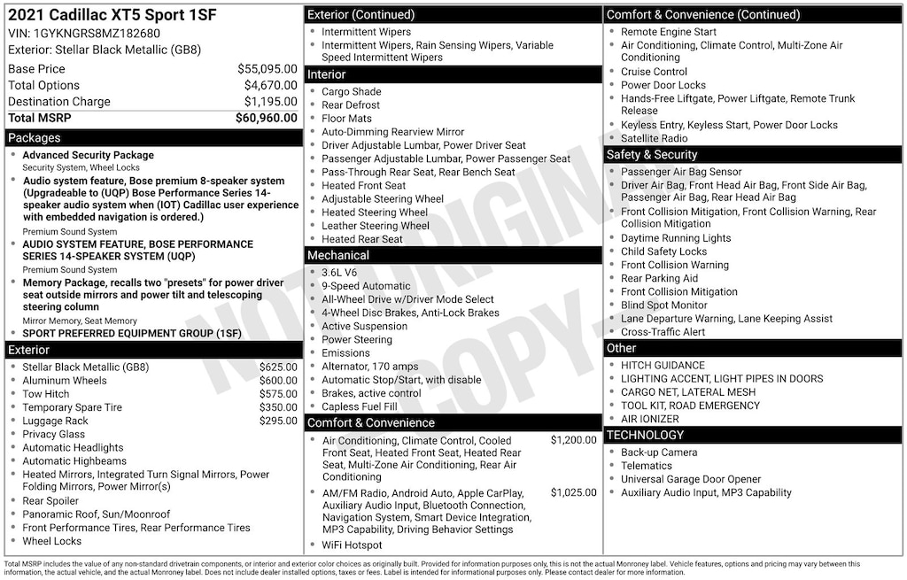 Fresh oil change, Fully detailed, 2-Way Power Driver Lumbar Control Seat Adjuster, 2-Way Power Passenger Lumbar Control Seat Adjuster, 3.49 Axle Ratio, 4-Wheel Disc Brakes, 8 Speakers, ABS brakes, Adaptive suspension, Air Conditioning, Air Ionizer, Alloy wheels, AM/FM radio: SiriusXM, Apple CarPlay/Android Auto, Audio memory, Auto High-beam Headlights, Auto-dimming door mirrors, Auto-dimming Rear-View mirror, Automatic Dual-Zone Climate Control, Automatic Emergency Braking, Automatic Stop/Start w/Disable, Automatic temperature control, Black Roof Rack Cross Rails, Bodyside moldings, Bose Performance Series 14 Speakers System, Bose Premium 8-Speaker Audio System Feature, Brake assist, Bumpers: body-color, Compass, Delay-off headlights, Driver door bin, Driver vanity mirror, Dual Driver Info Center Display Gauge Cluster, Dual front impact airbags, Dual front side impact airbags, Electronic Stability Control, Emergency communication system: OnStar and Cadillac connected services capable, Exterior Parking Camera Rear, Four wheel independent suspension, Front & Rear Park Assist, Front anti-roll bar, Front Bucket Seats, Front Center Armrest, Front dual zone A/C, Front reading lights, Fully automatic headlights, Garage door transmitter, HD Rear Vision Camera, Heated door mirrors, Heated Driver & Front Passenger Seats, Heated front seats, Heated Rear Outboard Seating Positions, Heated steering wheel, Hitch Guidance, Hitch Guidance w/Hitch View, Illuminated entry, Inside Rear-View Auto-Dimming Mirror, Knee airbag, Lateral Mesh Cargo Net, Leather Seating Surfaces w/Mini Perforated Inserts, Leather steering wheel, Light Pipes in Doors Lighting Accent, Low tire pressure warning, Memory seat, Occupant sensing airbag, Outside temperature display, Overhead airbag, Overhead console, Panic alarm, Passenger door bin, Passenger vanity mirror, Performance Suspension, Power door mirrors, Power driver seat, Power Liftgate, Power moonroof: UltraView, Power passenger seat, Power steering, Power windows, Radio data system, Radio: Cadillac User Experience AM/FM Stereo, Radio: Cadillac User Experience w/Embedded Nav, Rain sensing wipers, Rear anti-roll bar, Rear reading lights, Rear seat center armrest, Rear window defroster, Rear window wiper, Remote keyless entry, Road Emergency Tool Kit, Security system, SiriusXM w/360L, Smart Towing, Speed control, Speed-sensing steering, Split folding rear seat, Spoiler, Sport Package 1SF, Steering wheel memory, Steering wheel mounted audio controls, Tachometer, Teen Driver, Telescoping steering wheel, Tilt steering wheel, Traction control, Tri-Zone Automatic Climate Control, Trip computer, Turn signal indicator mirrors, Variably intermittent wipers, Ventilated Driver & Front Passenger Seats, Voltmeter, Wheels: 20" 12-Spoke Alloy w/Pearl Nickel Finish, Wheels: 20" 12-Spoke Diamond Cut Alloy.