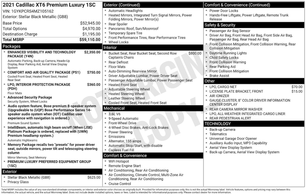 Stellar Black Metallic 2021 Cadillac XT6 Premium Luxury 3.6L V6 DI VVT FWD 4D Sport Utility 9-Speed Automatic