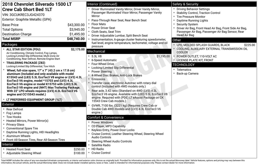 Safety inspected, 6-Speed Automatic Electronic with Overdrive, 4WD, Black Cloth, 10-Way Power Driver's Seat Adjuster, 110-Volt AC Power Outlet, 150 Amp Alternator, 4-Wheel Disc Brakes, 4.2" Diagonal Color Display Driver Info Center, 40/20/40 Front Split Bench Seat, 6 Speaker Audio System, 6 Speakers, ABS brakes, Air Conditioning, All Star Edition, Alloy wheels, AM/FM radio: SiriusXM, Auxiliary External Transmission Oil Cooler, Bluetooth® For Phone, Body Color Bodyside Moldings, Body-Color Door Handles, Body-Color Mirror Caps, Body-Color Power Adjustable Heated Outside Mirrors, Bodyside moldings, Brake assist, CD player, Chevrolet Connected Access, Chevrolet w/4G LTE, Cloth Seat Trim, Color-Keyed Carpeting w/Rubberized Vinyl Floor Mats, Compass, Deep-Tinted Glass, Delay-off headlights, Driver & Front Passenger Illuminated Vanity Mirrors, Driver door bin, Driver vanity mirror, Dual front impact airbags, Dual front side impact airbags, Dual-Zone Automatic Climate Control, Electric Rear-Window Defogger, Electronic Stability Control, Exterior Parking Camera Rear, EZ Lift & Lower Tailgate, Front anti-roll bar, Front Center Armrest w/Storage, Front Chrome Bumper, Front License Plate Kit, Front reading lights, Front wheel independent suspension, Fully automatic headlights, HD Radio, Heated door mirrors, Heated Driver & Front Passenger Seats, Heavy-Duty Rear Locking Differential, High-Intensity Discharge Headlights, Illuminated entry, Leather Wrapped Steering Wheel w/Cruise Controls, Low tire pressure warning, Manual Tilt Wheel Steering Column, Manual Tilt/Telescoping Steering Column, Molded Black Splash Guards (LPO), Occupant sensing airbag, OnStar & Chevrolet Connected Services Capable, Outside temperature display, Overhead airbag, Overhead console, Panic alarm, Passenger door bin, Passenger vanity mirror, Power door mirrors, Power steering, Power windows, Power Windows w/Driver Express Up, Premium audio system: Chevrolet MyLink, Radio data system, Radio: AM/FM 8" Diagonal Color Touch Screen, Rear 60/40 Folding Bench Seat (Folds Up), Rear Chrome Bumper, Rear reading lights, Rear seat center armrest, Rear step bumper, Rear Wheelhouse Liners, Remote Keyless Entry, Remote keyless entry, Remote Locking Tailgate, Remote Vehicle Starter System, Single Slot CD/MP3 Player, SiriusXM Satellite Radio, Speed control, Speed-sensing steering, Split folding rear seat, Steering Wheel Audio Controls, Steering wheel mounted audio controls, Tachometer, Theft Deterrent System (Unauthorized Entry), Thin Profile LED Fog Lamps, Tilt steering wheel, Traction control, Trailering Package, Trip computer, Variably intermittent wipers, Voltmeter, 6-Speed Automatic Electronic with Overdrive, 4WD, Black Cloth.