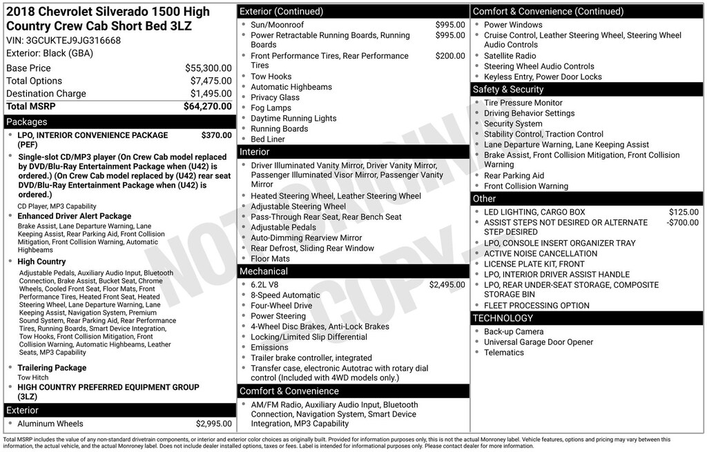 Safety inspected, 8-Speed Automatic with Overdrive, 4WD, Jet Black Medium Ash Gray Piping Stitching Leather, 110-Volt AC Power Outlet, 150 Amp Alternator, 4 Movable Upper Cargo Tie Downs, 4-Wheel Disc Brakes, 4.2" Diagonal Color Display Driver Info Center, 6" Rectangular Chromed Tubular Assist Steps, 7 Speakers, ABS brakes, Active Noise Cancellation, Adjustable pedals, Air Conditioning, Alloy wheels, AM/FM radio: SiriusXM, Assist Steps Not Desired or Alternate Step Desired, Auto High-beam Headlights, Auto-dimming door mirrors, Auto-Dimming Inside Rear-View Mirror, Auto-dimming Rear-View mirror, Automatic temperature control, Auxiliary External Transmission Oil Cooler, Bluetooth® For Phone, Body Color Rear Bumper w/Cornersteps, Bodyside moldings, Bose Speaker System, Brake assist, Bumpers: body-color, CD player, Chevrolet Connected Access, Chevrolet w/4G LTE, Chrome Bodyside Moldings, Chrome Cap Power-Adjustable Heated Outside Mirrors, Chrome Door Handles, Chrome Grille Surround, Chrome Mirror Caps, Chrome wheels, Color-Keyed Carpeted Floor Mats, Color-Keyed Carpeting w/Rubberized Vinyl Floor Mats, Compass, Console Insert Organizer Tray (LPO), Deep-Tinted Glass, Delay-off headlights, Driver & Front Passenger Illuminated Vanity Mirrors, Driver door bin, Driver vanity mirror, Dual front impact airbags, Dual front side impact airbags, Dual-Zone Automatic Climate Control, Electric Rear-Window Defogger, Electronic Stability Control, Enhanced Driver Alert Package, Exterior Parking Camera Rear, EZ Lift & Lower Tailgate, Floor Mounted Console, Forward Collision Alert, Front anti-roll bar, Front Body-Color Bumper, Front Bucket Seats, Front Center Armrest w/Storage, Front dual zone A/C, Front fog lights, Front Frame-Mounted Black Recovery Hooks, Front Full Feature Power Reclining Bucket Seats, Front License Plate Kit, Front reading lights, Front wheel independent suspension, Fully automatic headlights, Garage door transmitter, HD Radio, Heated & Vented Front Seating, Heated door mirrors, Heated front seats, Heated steering wheel, Heavy Duty Suspension, Heavy-Duty Rear Locking Differential, Illuminated entry, Integrated Trailer Brake Controller, IntelliBeam Automatic High Beam On/Off Headlight, Interior Convenience Package (LPO), Interior Driver Assist Handle (LPO), Lane Keep Assist, Leather Wrapped Heated Steering Wheel, Leather Wrapped Steering Wheel w/Cruise Controls, LED Cargo Box Lighting, LED Taillamps w/Signature, Low Speed Forward Automatic Braking, Low tire pressure warning, Manual Tilt/Telescoping Steering Column, Memory seat, Navigation System, Occupant sensing airbag, OnStar & Chevrolet Connected Services Capable, Outside temperature display, Overhead airbag, Overhead console, Panic alarm, Passenger door bin, Passenger vanity mirror, Perforated Leather Appointed Seat Trim, Polished Exhaust Tip, Power Adjustable Pedals, Power door mirrors, Power driver seat, Power passenger seat, Power Sliding Rear Window, Power steering, Power Sunroof, Power windows, Power Windows w/Driver Express Up, Power-Retractable Assist Steps, Preferred Equipment Group 3LZ, Premium audio system: Chevrolet MyLink, Radio data system, Radio: AM/FM 8" Diagonal Clr Touch Nav, Rear 60/40 Folding Bench Seat (Folds Up), Rear reading lights, Rear seat center armrest, Rear step bumper, Rear Under-Seat Composite Storage Bin (LPO), Rear Wheelhouse Liners, Rear window defroster, Remote Keyless Entry, Remote keyless entry, Remote Locking Tailgate, Remote Vehicle Starter System, Security system, Single Slot CD/MP3 Player, SiriusXM Satellite Radio, Speed control, Speed-sensing steering, Split folding rear seat, Spray-On Pickup Box Bed Liner, Steering Wheel Audio Controls, Steering wheel mounted audio controls, Tachometer, Telescoping steering wheel, Theft Deterr