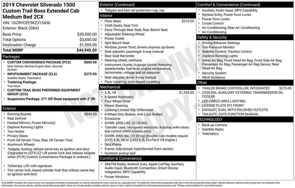 Safety inspected, 6-Speed Automatic Electronic with Overdrive, 4WD, Black Cloth, 170 Amp Alternator, 3.42 Rear Axle Ratio, 3.5" Diagonal Monochromatic Display, 4-Wheel Disc Brakes, 6 Speakers, ABS brakes, Air Conditioning, All-Weather Floor Liner (LPO) (AAK), Alloy wheels, AM/FM radio, Apple CarPlay/Android Auto, Auxiliary External Transmission Oil Cooler, Bluetooth® For Phone, Brake assist, Chevrolet Connected Access, Chevrolet w/4G LTE, Cloth Seat Trim, Color-Keyed Carpeting Floor Covering, Compass, Custom Convenience Package, Deep-Tinted Glass, Delay-off headlights, Driver door bin, Driver vanity mirror, Dual Exhaust w/Polished Outlets, Dual front impact airbags, Dual front side impact airbags, Electric Rear-Window Defogger, Electronic Cruise Control, Electronic Stability Control, Exterior Parking Camera Rear, EZ Lift Power Lock & Release Tailgate, Front 40/20/40 Split-Bench Seat, Front anti-roll bar, Front Center Armrest, Front License Plate Kit, Front reading lights, Front Rubberized Vinyl Floor Mats, Front wheel independent suspension, Fully automatic headlights, Heated door mirrors, Heavy-Duty Rear Locking Differential, High Capacity Air Filter, High Gloss Black Grille, Hill Descent Control, Hitch Guidance, Illuminated entry, Infotainment Package, Integrated Trailer Brake Controller, LED Cargo Area Lighting, Locking Tailgate, Low tire pressure warning, Manual Tilt Wheel Steering Column, Occupant sensing airbag, Off-Road Assist Steps (LPO), Off-Road Suspension w/2" Lift, OnStar & Chevrolet Connected Services Capable, Outside temperature display, Overhead airbag, Overhead console, Panic alarm, Passenger door bin, Passenger vanity mirror, Performance Red Recovery Hooks, Polished Exhaust Tip, Power Door Locks, Power door mirrors, Power Front Windows w/Driver Express Up/Down, Power Front Windows w/Passenger Express Down, Power Rear Windows w/Express Down, Power steering, Power windows, Preferred Equipment Group 2CX, Premium audio system: Chevrolet Infotainment System 3, Radio data system, Radio: Chevrolet Infotainment 3 System, Rear 60/40 Folding Bench Seat (Folds Up), Rear reading lights, Rear Rubberized-Vinyl Floor Mats, Rear step bumper, Remote Keyless Entry, Remote keyless entry, Remote Vehicle Starter System, SiriusXM Radio, Speed control, Speed-sensing steering, Split folding rear seat, Suspension Package, Tachometer, Theft Deterrent System (Unauthorized Entry), Tilt steering wheel, Traction control, Trailering Package, Trip computer, Variably intermittent wipers, Voltmeter, Wheels: 18" x 8.5" Black Painted Aluminum, 6-Speed Automatic Electronic with Overdrive, 4WD, Black Cloth.