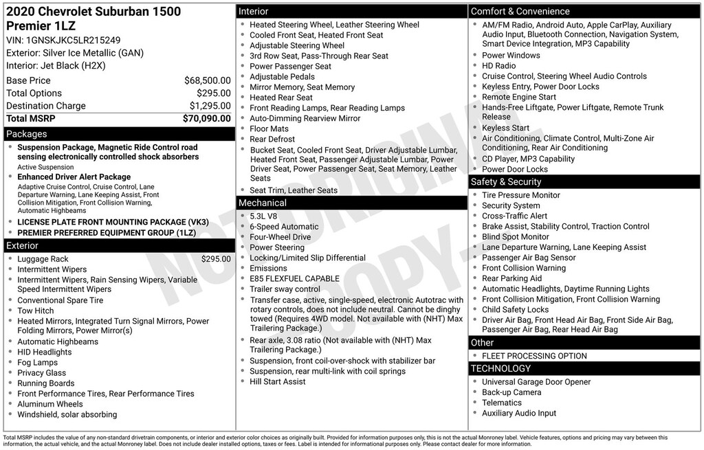 Safety inspected, 10 Speakers, 12-Volt Auxiliary Power Outlet (5), 1st & 2nd Row Color-Keyed Carpeted Floor Mats, 3.08 Rear Axle Ratio, 3rd Row 60/40 Power Fold Split-Bench, 3rd row seats: split-bench, 4-Wheel Antilock Disc Brakes, 4-Wheel Disc Brakes, 6-Way Power Front Passenger Seat Adjuster, ABS brakes, Adaptive suspension, Adjustable pedals, Air Conditioning, Alloy wheels, AM/FM radio: SiriusXM, AM/FM Stereo w/Navigation, Apple CarPlay/Android Auto, Auto High-beam Headlights, Auto-dimming door mirrors, Auto-Dimming Inside Rear-View Mirror, Auto-dimming Rear-View mirror, Auto-leveling suspension, Automatic Emergency Braking, Automatic temperature control, Black Assist Steps, Black Roof Rack Cross Bars, Bodyside moldings, Bose Centerpoint Premium 10-Speaker Surround Sound, Brake assist, Bumpers: body-color, CD player, Color-Keyed Carpeting Floor Covering, Compass, Delay-off headlights, Driver door bin, Driver Inboard & Front Passenger Airbags, Driver vanity mirror, Dual front impact airbags, Dual front side impact airbags, Electronic Cruise Control w/Set & Resume Speed, Electronic Stability Control, Emergency communication system: OnStar and Chevrolet connected services capable, Enhanced Driver Alert Package, Exterior Parking Camera Rear, Floor Console w/Storage Area, Fog Lamps, Forward Collision Alert, Front & Rear Park Assist, Front anti-roll bar, Front Bucket Seats, Front Center Armrest, Front dual zone A/C, Front fog lights, Front reading lights, Front wheel independent suspension, Fully automatic headlights, Garage door transmitter, Hands-Free Power Liftgate, HD Radio, Headphones, Heated & Ventilated Driver & Front Passenger Seats, Heated & Ventilated Front Reclining Bucket Seats, Heated 2nd Row Outboard Seats, Heated door mirrors, Heated front seats, Heated Leather Wrapped Steering Wheel, Heated rear seats, Heated steering wheel, High-Intensity Discharge Headlights, Illuminated entry, IntelliBeam w/Automatic High Beam On/Off, Lane Change Alert w/Side Blind Zone Alert, Lane Keep Assist w/Lane Departure Warning, Leather Shift Knob, Leather steering wheel, License Plate Front Mounting Package, Low tire pressure warning, Magnetic Ride Control Suspension Package, Memory seat, Memory Settings, Navigation System, Occupant sensing airbag, Outside temperature display, Overhead airbag, Overhead console, Panic alarm, Passenger door bin, Passenger vanity mirror, Passive Entry System, Pedal memory, Perforated Leather-Appointed Seat Trim, Power door mirrors, Power driver seat, Power Folding & Adjustable Heated Outside Mirrors, Power Liftgate, Power passenger seat, Power Release 2nd Row Bucket Seats, Power steering, Power Tilt & Telescoping Steering Column, Power windows, Power-Adjustable Accelerator & Brake Pedals, Preferred Equipment Group 1LZ, Push Button Keyless Start, Rain sensing wipers, Rear air conditioning, Rear anti-roll bar, Rear audio controls, Rear Cross Traffic Alert, Rear reading lights, Rear window defroster, Rear window wiper, Remote keyless entry, Remote Vehicle Start, Roof-Mounted Luggage Rack Side Rails, Safety Alert Seat, Security system, Single-Slot CD/MP3 Player, SiriusXM NavTraffic, SiriusXM Radio, Speed control, Speed-sensing steering, Split folding rear seat, Spoiler, Steering wheel memory, Steering wheel mounted audio controls, Tachometer, Telescoping steering wheel, Tilt steering wheel, Traction control, Trip computer, Turn signal indicator mirrors, Universal Home Remote, Variably intermittent wipers, Ventilated front seats, Voltmeter, Wheels: 20" x 9" Polished-Aluminum, Wireless Charging.
