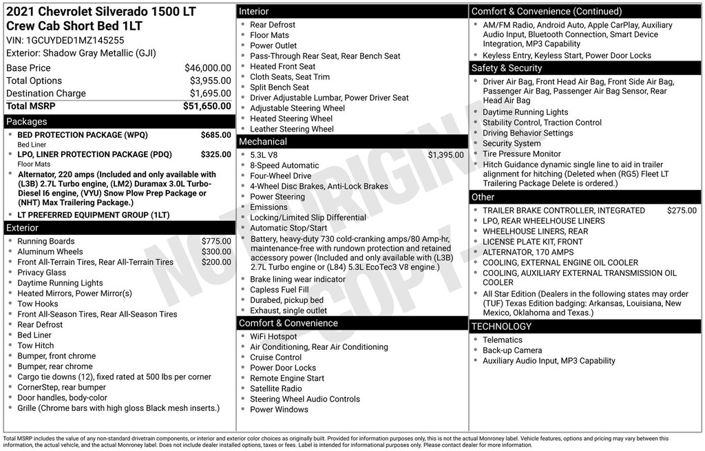 Safety inspected, 8-Speed Automatic, 4WD, Black Cloth, 10-Way Power Driver Seat w/Lumbar, 12-Volt Rear Auxiliary Power Outlet, 170 Amp Alternator, 2 USB Ports (First Row), 220 Amp Alternator, 3.23 Rear Axle Ratio, 4-Wheel Disc Brakes, 4.2" Diagonal Color Display Driver Info Center, 4" Chromed Round Assist Steps (LPO), 40/20/40 Front Split-Bench Seat, 4G LTE Wi-Fi Hot Spot Capable, 6 Speakers, ABS brakes, Air Conditioning, All-Star Edition, All-Weather Floor Liner (LPO), Alloy wheels, AM/FM radio: SiriusXM, Apple CarPlay/Android Auto, Auto-Locking Rear Differential, Automatic temperature control, Auxiliary External Transmission Oil Cooler, Bed Protection Package, Bluetooth® For Phone, Brake assist, Bumpers: chrome, Chevrolet Connected Access Capable, Chevytec Spray-On Black Bedliner, Chrome Grille, Chrome Mirror Caps, Cloth Seat Trim, Color-Keyed Carpeting Floor Covering, Compass, Convenience Package, Deep-Tinted Glass, Delay-off headlights, Driver door bin, Driver vanity mirror, Dual front impact airbags, Dual front side impact airbags, Dual-Zone Automatic Climate Control, Electric Rear-Window Defogger, Electrical Lock Control Steering Column, Electronic Cruise Control, Electronic Stability Control, External Engine Oil Cooler, EZ Lift Power Lock & Release Tailgate, Front anti-roll bar, Front Center Armrest w/Storage, Front dual zone A/C, Front Frame-Mounted Black Recovery Hooks, Front License Plate Kit, Front reading lights, Front Rubberized Vinyl Floor Mats, Front wheel independent suspension, Fully automatic headlights, Heated door mirrors, Heated Driver & Front Outboard Passenger Seats, Heated front seats, Heated Steering Wheel, Heated steering wheel, Heavy Duty Suspension, Hitch Guidance, Illuminated entry, Integrated Trailer Brake Controller, Keyless Open & Start, Leather Wrapped Steering Wheel, LED Cargo Area Lighting, Liner Protection Package (LPO), Low tire pressure warning, Manual Tilt/Telescoping Steering Column, Occupant sensing airbag, OnStar & Chevrolet Connected Services Capable, Outside temperature display, Overhead airbag, Overhead console, Panic alarm, Passenger door bin, Passenger vanity mirror, Power Door Locks, Power door mirrors, Power driver seat, Power Front Windows w/Driver Express Up/Down, Power Front Windows w/Passenger Express Down, Power Rear Windows w/Express Down, Power steering, Power windows, Preferred Equipment Group 1LT, Premium audio system: Chevrolet Infotainment 3, Radio data system, Radio: Chevrolet Infotainment 3 System, Rear 60/40 Folding Bench Seat (Folds Up), Rear Dual USB Charging-Only Ports, Rear reading lights, Rear Rubberized-Vinyl Floor Mats, Rear step bumper, Rear Vision Camera, Rear Wheel House Liners (LPO), Rear Wheelhouse Liners, Rear window defroster, Remote keyless entry, Remote Vehicle Starter System, Security system, SiriusXM Radio, Speed control, Speed-sensing steering, Split folding rear seat, Standard Tailgate, Steering Wheel Audio Controls, Steering wheel mounted audio controls, Tachometer, Telescoping steering wheel, Theft Deterrent System (Unauthorized Entry), Tilt steering wheel, Traction control, Trailering Package, Trip computer, Variably intermittent wipers, Voltmeter, Wheels: 17" x 8" Bright Silver Painted Aluminum, Wheels: 18" x 8.5" Bright Silver Painted Aluminum, 8-Speed Automatic, 4WD, Black Cloth.