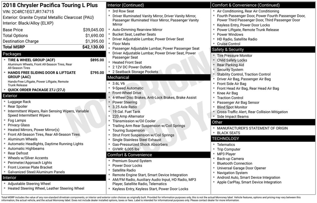 Safety inspected, 1-Year SiriusXM Guardian Trial, 13 Speakers, 17" x 7.0" Aluminum Wheels, 18" x 7.5" Painted Aluminum Wheels, 3.25 Axle Ratio, 3rd row seats: split-bench, 4-Wheel Disc Brakes, 8.4" Touchscreen Display, A/V remote, ABS brakes, Air Conditioning, Alloy wheels, AM/FM radio: SiriusXM, Apple CarPlay, Apple CarPlay/Android Auto, Auto High-beam Headlights, Auto-dimming Rear-View mirror, Automatic temperature control, Black Seats, Bodyside moldings, Brake assist, Bumpers: body-color, CD player, Compass, Delay-off headlights, Disassociated Touchscreen Display, Driver door bin, Driver vanity mirror, Driver's Seat Mounted Armrest, Dual front impact airbags, Dual front side impact airbags, DVD-Audio, Electronic Stability Control, Emergency communication system: Uconnect Access, For Details, Visit DriveUconnect.com, Four wheel independent suspension, Front anti-roll bar, Front Bucket Seats, Front dual zone A/C, Front fog lights, Front reading lights, Fully automatic headlights, Garage door transmitter, Google Android Auto, GPS Antenna Input, GPS Navigation, Hands Free Power Liftgate, Hands Free Sliding Door & Liftgate Group, Hands Free Sliding Doors, HD Radio, Headphones, Heated door mirrors, Heated front seats, Heated rear seats, Heated steering wheel, Illuminated entry, Integrated Voice Command w/Bluetooth, Knee airbag, Leather steering wheel, Low tire pressure warning, Manufacturer's Statement of Origin, Michelin Brand Tires, Navigation System, Occupant sensing airbag, Outside temperature display, Overhead airbag, Overhead console, Panic alarm, ParkView Rear Back-Up Camera, Passenger door bin, Passenger seat mounted armrest, Passenger vanity mirror, Perforated Leather Trim Bucket Seats, Power door mirrors, Power driver seat, Power Liftgate, Power passenger seat, Power steering, Power windows, Quick Order Package 27J, Radio data system, Radio: Uconnect 4C Nav w/8.4" Display, Rain sensing wipers, Rear air conditioning, Rear reading lights, Rear window defroster, Rear window wiper, Reclining 3rd row seat, Remote keyless entry, Roof rack, Security system, SiriusXM Satellite Radio, SiriusXM Traffic Plus, SiriusXM Travel Link, Speed control, Split folding rear seat, Spoiler, Steering wheel mounted audio controls, Tachometer, Telescoping steering wheel, Tilt steering wheel, Tire & Wheel Group, Touring Suspension, Traction control, Trip computer, USB Host Flip, Variably intermittent wipers, Voltmeter, Wheels: 18" x 7.5" Aluminum (DISC).