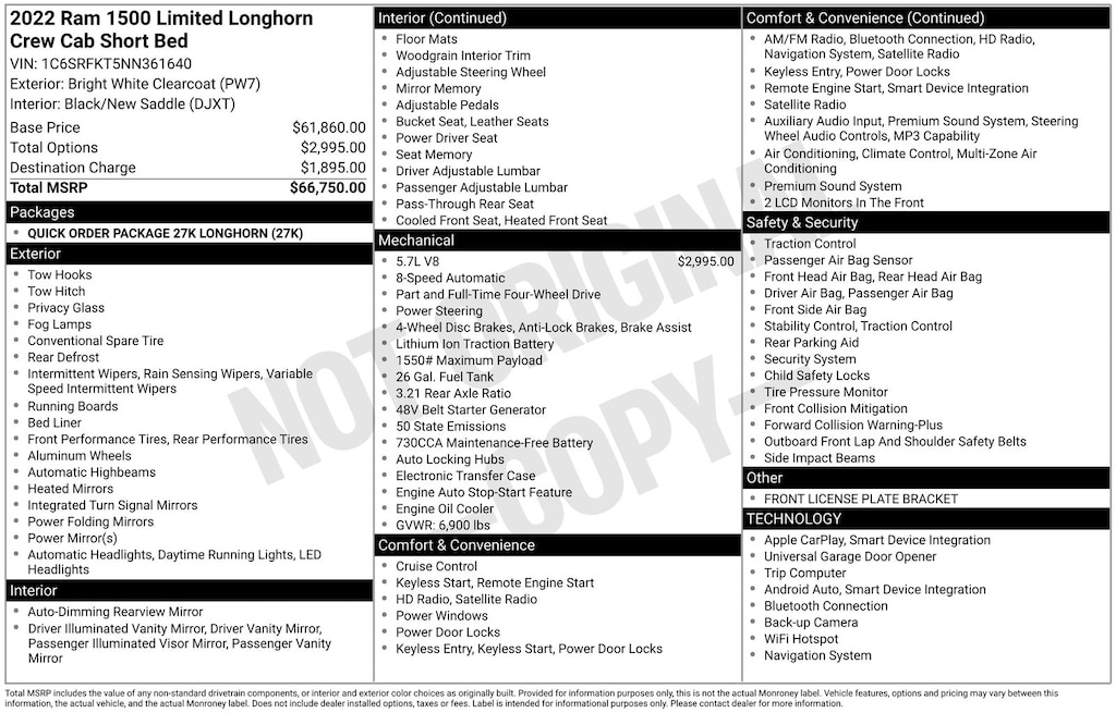 Safety inspected, #1 Seat Foam Cushion, 10 Speakers, 3 Rear Seat Head Restraints, 3.21 Rear Axle Ratio, 4 Way Front Headrests, 4-Wheel Disc Brakes, 48V Belt Starter Generator, 4G LTE Wi-Fi Hot Spot, ABS brakes, Adjustable pedals, Air Conditioning, Alloy wheels, AM/FM radio: SiriusXM, Apple CarPlay, Apple CarPlay/Android Auto, Audio memory, Auto High-beam Headlights, Auto-dimming door mirrors, Auto-dimming Rear-View mirror, Automatic temperature control, Brake assist, Bucket Seats, Bumpers: chrome, Chrome Exterior Mirrors, Compass, Connected Travel & Traffic Services, Connectivity - US/Canada, Delay-off headlights, Disassociated Touchscreen Display, Driver door bin, Driver Seat Memory, Driver vanity mirror, Dual front impact airbags, Dual front side impact airbags, Electronic Stability Control, Exterior Mirrors Courtesy Lamps, Exterior Mirrors w/Heating Element, Exterior Mirrors w/Memory, Exterior Mirrors w/Supplemental Signals, For Details, Visit DriveUconnect.com, Front anti-roll bar, Front Bucket Seats, Front Center Armrest w/Storage, Front dual zone A/C, Front fog lights, Front License Plate Bracket, Front reading lights, Front Seat Back Map Pockets, Front wheel independent suspension, Full Length Premium Floor Console, Fully automatic headlights, Garage door transmitter, Genuine wood console insert, Genuine wood dashboard insert, Genuine wood door panel insert, Global Telematics Box Module (TBM), Google Android Auto, GPS Antenna Input, GPS Navigation, HD Radio, Heated door mirrors, Heated Front Seats, Heated front seats, Heated rear seats, Heated Second Row Seats, Heated Steering Wheel, Heated steering wheel, Heavy-Duty Engine Cooling, Illuminated entry, Integrated Center Stack Radio, Integrated Voice Command w/Bluetooth, Leather steering wheel, Leather Trimmed Bucket Seats, Low tire pressure warning, Memory seat, Navigation System, Occupant sensing airbag, Outside temperature display, Overhead airbag, Overhead console, Panic alarm, ParkView Rear Back-Up Camera, Passenger door bin, Passenger vanity mirror, Pedal memory, Power 4-Way Driver Lumbar Adjust, Power 4-Way Passenger Lumbar Adjust, Power 8-Way Driver & Passenger Seats, Power door mirrors, Power driver seat, Power passenger seat, Power steering, Power windows, Power-Folding Mirrors, Quick Order Package 27K Longhorn, Radio data system, Radio: Uconnect 5 Nav w/8.4" Display, Rain sensing wipers, Rear 60/40 Folding Split Recline Seat, Rear anti-roll bar, Rear seat center armrest, Rear step bumper, Rear window defroster, Remote keyless entry, Security system, SiriusXM Radio Service, SiriusXM w/360L, Speed control, Split folding rear seat, Steering wheel mounted audio controls, Tachometer, Telescoping steering wheel, Tilt steering wheel, Traction control, Trip computer, Turn signal indicator mirrors, USB Host Flip, Variably intermittent wipers, Ventilated Front Seats, Ventilated front seats, Voltmeter, Wheels: 20" x 9" Aluminum Painted/Polished.